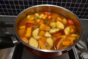 Add the chopped butternut squash and chopped apple to the pan, then pour in just enough vegetable stock to cover all the ingredients – I found this to be around 800 ml. Bring to a boil, then turn down the heat and simmer, ideally with a lid on the pan (I like to use a pan with a see-through lid so I can see how the soup’s doing without removing the lid constantly).